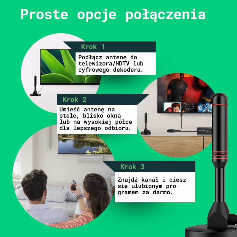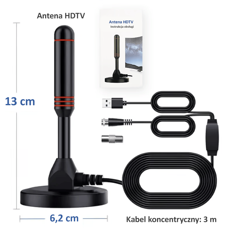 Dzięki swojej formie ta antena może odbierać sygnały w zakresie 360°, zapewniając dobrą jakość obrazu. Antena HDTV została zaprojektowana z odłączaną magnetyczną podstawą dla łatwiejszego użytkowania i lepszego odbioru sygnału.